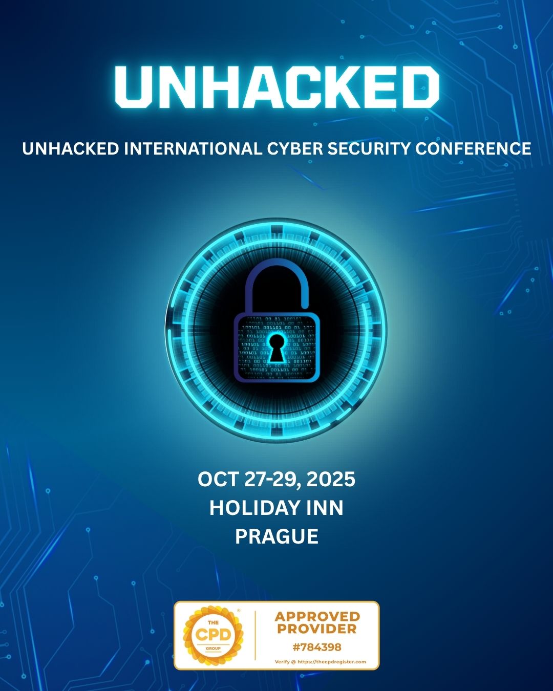Welcome to Unhacked International Cyber Security Conference 2025 — where innovation meets action in the heart of Europe. Join us from October 27–29 at the Holiday Inn Prague, Czech Republic for an unforgettable experience that brings together cybersecurity leaders, innovators, and visionaries from across the globe. Unhacked 2025 is more than a conference — it’s a platform for empowering professionals, elevating research, and advancing global collaboration. Earn 24 CPD credits as you engage with dynamic sessions, interactive workshops, and groundbreaking keynote presentations.